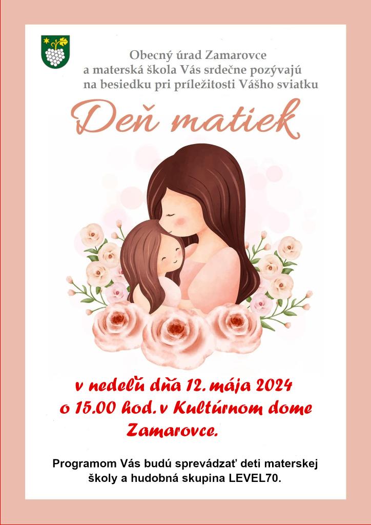 OcÚ Zamarovce, vedenie materskej školy, poslanci OcZ a starosta obce srdečne pozývajú všetky mamičky, staré mamy a prababičky na oslavu sviatku „Dňa matiek“, ktorá sa uskutoční v nedeľu dňa 12.05.2024 o 15.00 hod. v Kultúrnom dome v Zamarovciach. Príjemnú atmosféru navodia svojím vystúpením deti z MŠ Zamarovce a skupina LEVEL70. Pripravili sme pre Vás a deti skromné občerstvenie.