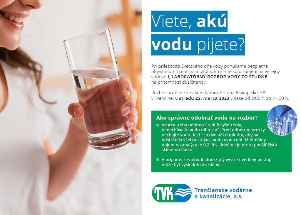 Trenčianske vodárne a kanalizácie a.s. Trenčín oznamujú občanom, že pri príležitosti Svetového dńa vody ponúkajú bezplatne obyvateľom Trenčína a okolia, ktorí nie sú pripojení na verejný vodovod LABORATÓRNY ROZBOR VODY ZO STUDNE na prítomnosť dusičnanov v stredu 22.03.2023 v čase od 8,00 hod. do 14,00 hod. ...
