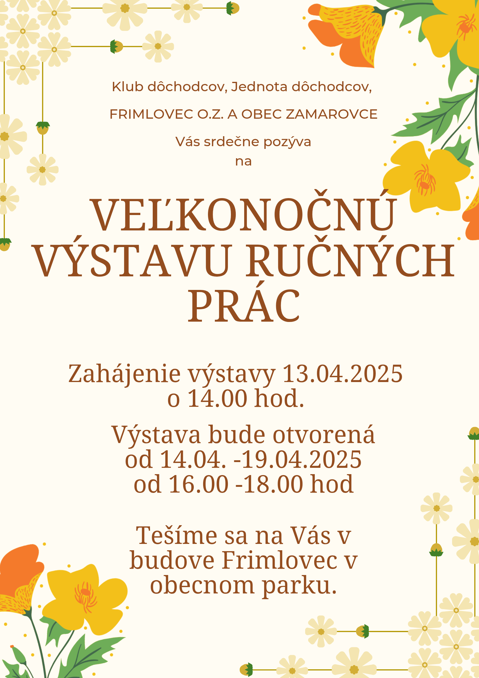 Frimlovec o.z. a Obec Zamarovce Vás srdečne pozývajú na Veľkonočný rínek na Frimlovci dňa 13.04.2025 (nedeľa) v čase od 14.00 hod. Tešiť sa môžete na ukážky zdobenia veľkonočných vajíčok, pletenia korbáčov, výrobu dekorácií a tiež malý remeselný jarmok. Súčasťou bude aj výstava ručných prác v budove Frimlovec, ktorú budete môcť navštíviť tiež v priebehu nasledujúceho týždňa (14.04.-19.04.2025) v čase od 16.00 do 18.00 hod.
