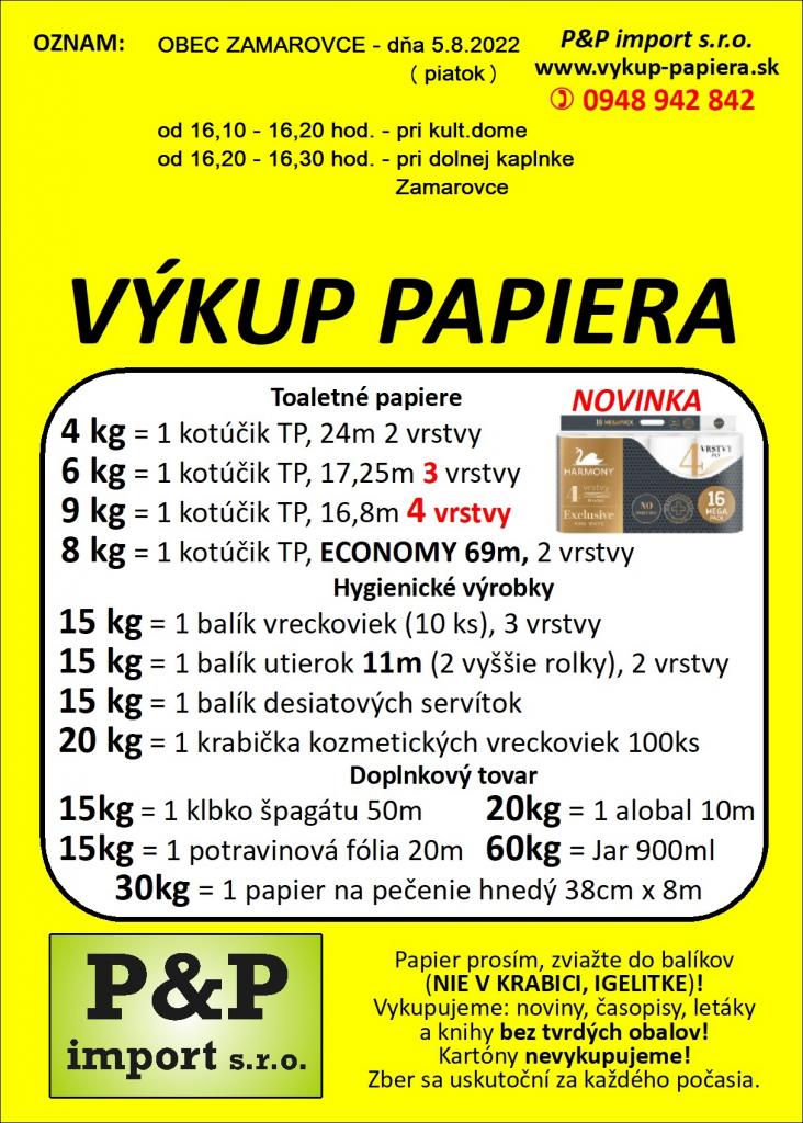 Obecný úrad Zamarovce oznamuje občanom, že v PIATOK 05.08.2022 sa uskutoční v našej obci výkup papiera (výmenou za hygienické výrobky) nasledovne: