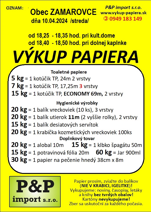 v našej obci výkup papiera (výmenou za hygienické výrobky) nasledovne: