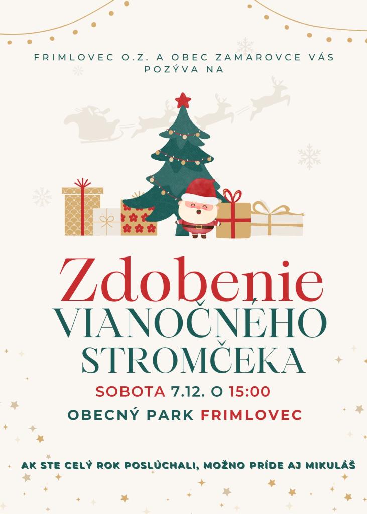 Vážení občania, Obec Zamarovce a Frimlovec o.z. pozývajú všetky deti a rodičov v sobotu 7. decembra 2024 o 15.00 hod. do obecného parku Frimlovec na „Zdobenie vianočného stromčeka“ vlastnoručne vyrobenými ozdobami. Budeme čakať na príchod Mikuláša, ktorý nám stromček rozsvieti a dobrým deťom rozdá balíčky plné maškŕt. Tešíme sa na všetky deti z našej obce, narodené v rokoch 2014 až 2024.